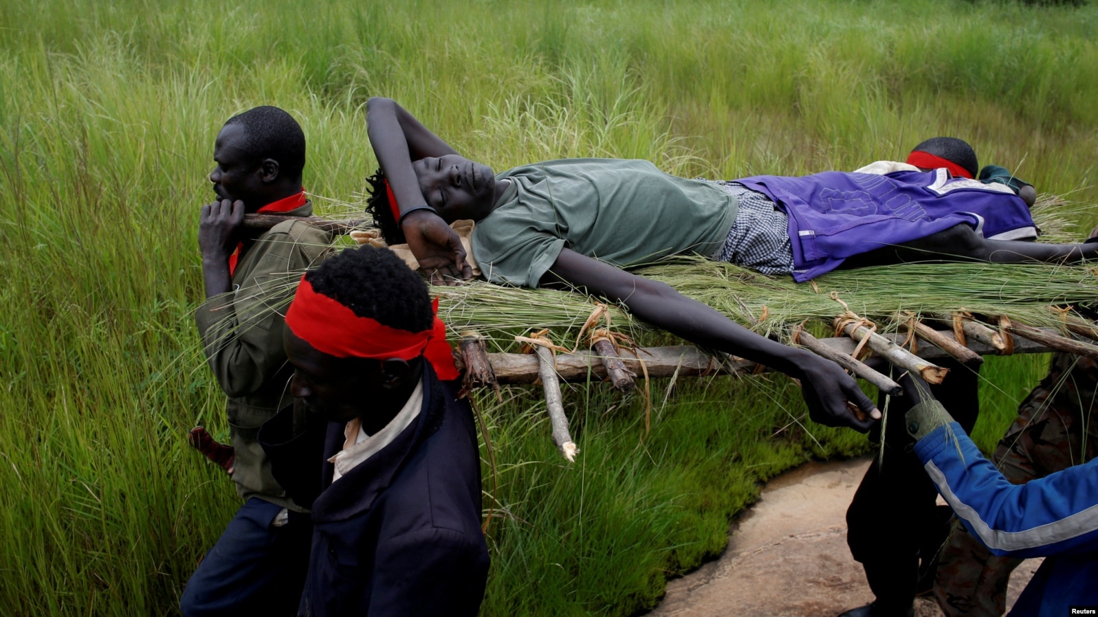 FILE - SPLA-IO (SPLA-In Opposition) rebels carry an injured rebel after an assault on government SPLA (Sudan People's Liberation Army) soldiers, on the road between Kaya and Yondu, South Sudan, August 26, 2017.